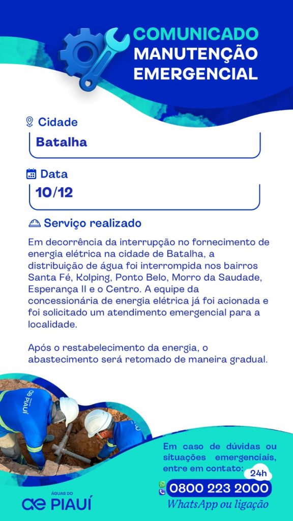 A Águas do Piauí reitera seu compromisso em oferecer serviços de qualidade com eficiência e segurança à população. A concessionária está à disposição dos moradores, para esclarecer dúvidas e registrar demandas, inclusive emergenciais, através dos seus canais oficiais de atendimento, são eles: o número 0800 223 2000, disponível para ligações e mensagens no WhatsApp, além do aplicativo Águas App e o site www.aguasdopiaui.com.br.