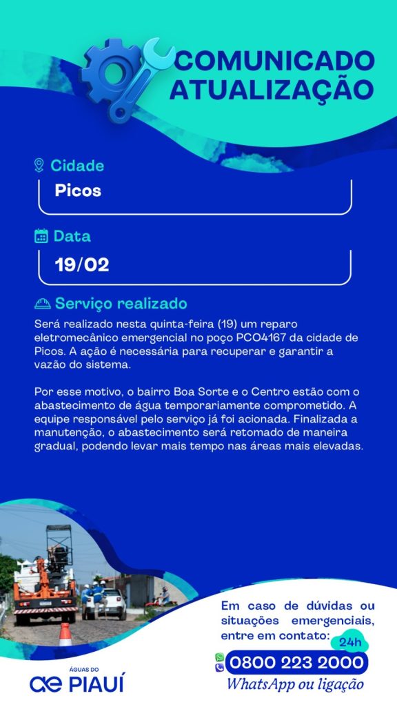 A intervenção no bairro Bomba integra um conjunto de melhorias já realizadas em Picos. Nos últimos meses, a concessionária promoveu a perfuração de novos poços nos bairros Morro da Macambira e Morada Nova e segue com a perfuração de um novo poço no bairro Aerolândia. Também foram executadas ações de limpeza, instalação de novos equipamentos, interligações de rede e modernizações no sistema de abastecimento.