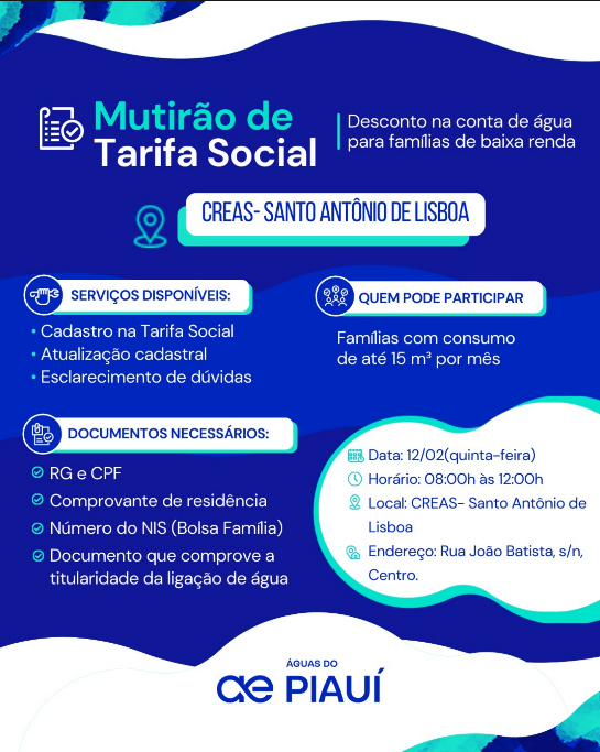 “Convidamos as famílias de Itainópolis e Santo Antônio de Lisboa que se enquadram nos critérios do programa a participarem dos mutirões. A Tarifa Social é um direito e pode fazer diferença no orçamento mensal das famílias”, destaca.