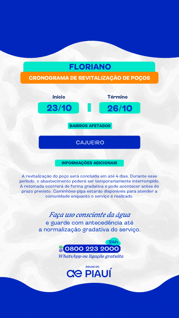 A Águas do Piauí é a responsável pelos serviços de abastecimento de água e esgotamento sanitário nos 224 municípios do Piauí.