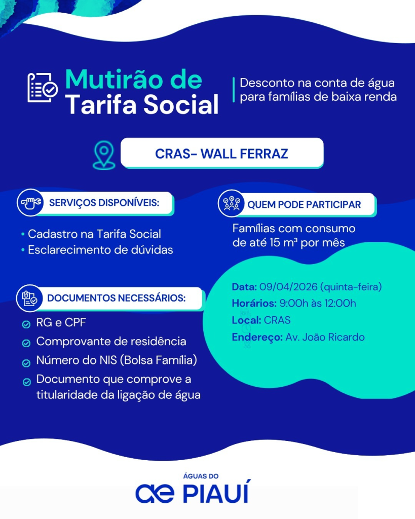 A Águas do Piauí realizará, nesta semana, dois mutirões para cadastro na Tarifa Social nos municípios de Fronteiras e Wall Ferraz, com o objetivo de ampliar o acesso ao benefício que garante 50% de desconto na conta de água para famílias de baixa renda. As ações acontecerão na terça-feira, 07 de abril, em Fronteiras, e na quinta-feira, 09 de abril, em Wall Ferraz, com atendimentos concentrados nos CRAS de cada município.